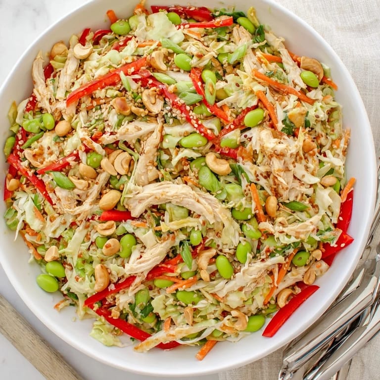 Pin It The first time I made this salad, I was trying to use up leftover rotisserie chicken and a bag of edamame from my freezer. I tossed everything together on a humid Tuesday afternoon when turning on the oven felt like punishment. The crunch of cabbage against the creamy chicken, that zing of ginger hitting my tongueβit instantly became my go-to when I want something substantial but not heavy.