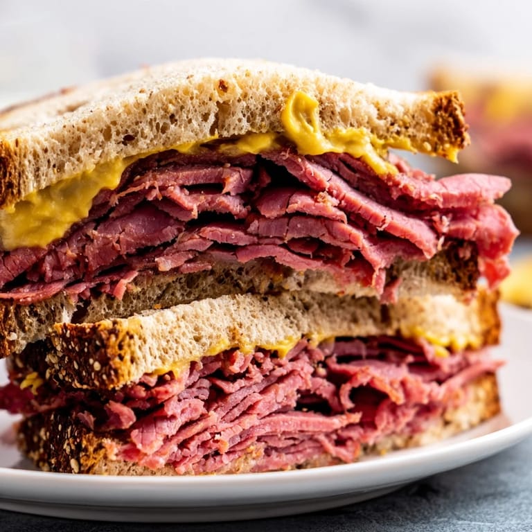 My roommate senior year of college worked weekends at a Jewish deli and would sometimes come home with paper bags full of ends and extras. We ate variations of this sandwich at 2am while studying for finals huddled over textbooks with mustard on our sleeves. Those late nights taught me that the best food doesnt require fancy techniques just quality ingredients piled high without apology.